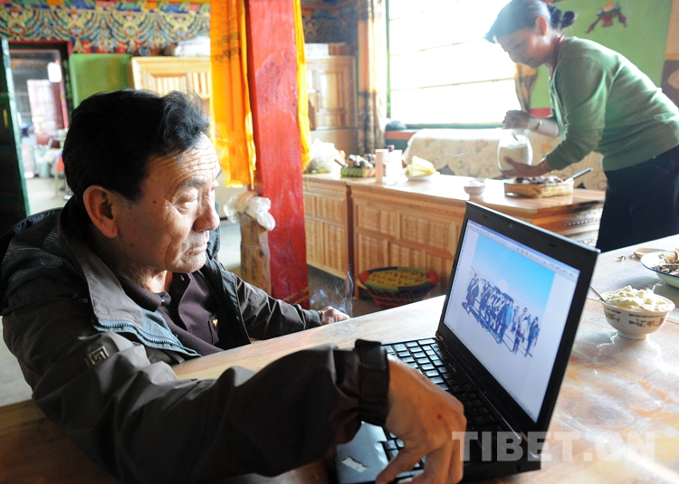 Photo shows Sonam Gongpo looks at his old friend's photos on a computer.