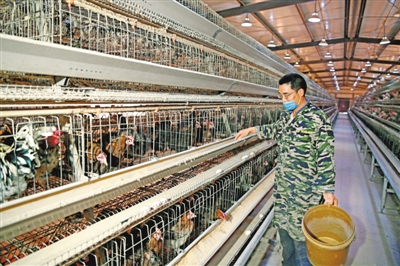 An employee of the Kanggong Chicken Farm is feeding chickens.[Photo/xzxw.com]