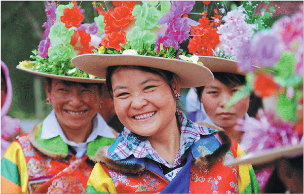 Villagers show their gratitude for their improved lives after they benefited from rural tourism, running rural breakfast-and-bed businesses and selling traditional handicrafts and other local specialties, since they were relocated from their original mountainous dwellings in 2016. [Photo/China Daily]