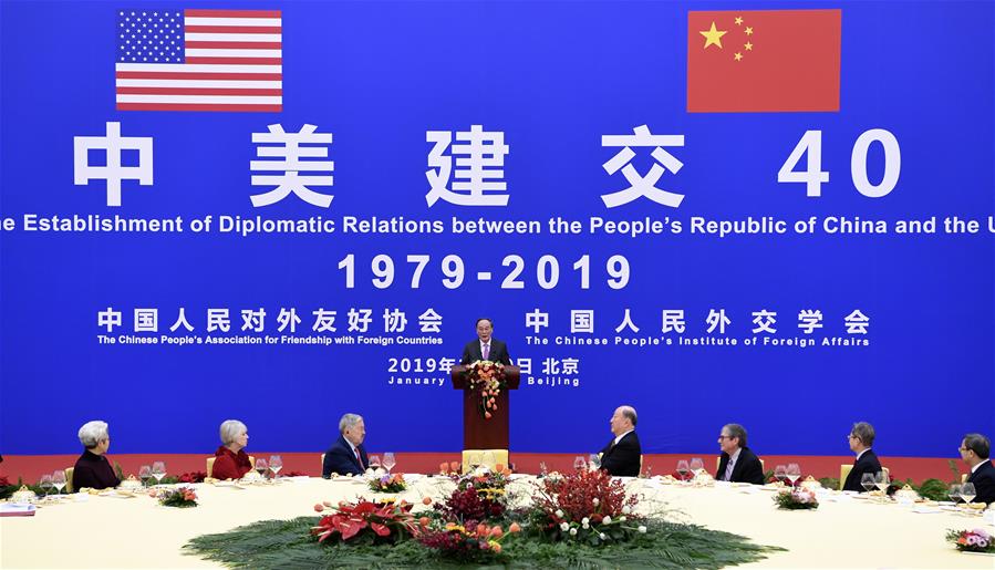 Chinese Vice President Wang Qishan addresses a reception marking the 40th anniversary of the establishment of diplomatic relations between China and the United States in the Great Hall of the People in Beijing, capital of China, Jan. 10, 2019.[Photo/Xinhua]