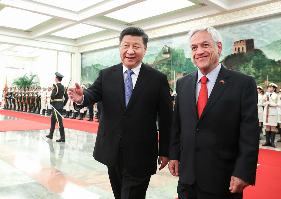 President Xi Jinping holds a welcoming ceremony for Chilean President Sebastian Pinera in the Great Hall of the People in Beijing on Wednesday. [Photo/China Daily]