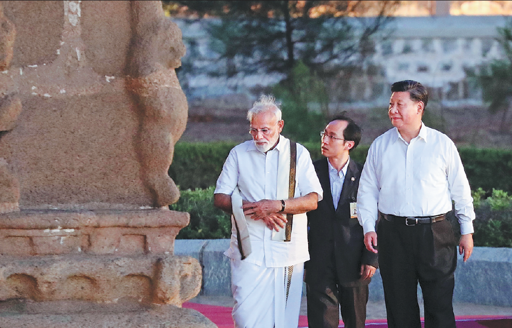 President Xi Jinping walks with Indian Prime Minister Narendra Modi after he arrives in Chennai, India, on Friday. Xi’s trip, which extends into the weekend, includes a second informal summit with Modi and the first visit to Nepal by a Chinese president in 23 years. [XU JINGXING / CHINA DAILY]