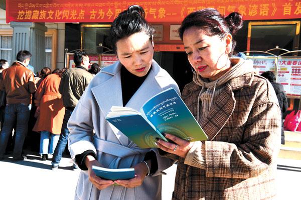 Two urban residents are reading Tibetan Folk Meteorological Proverbs.