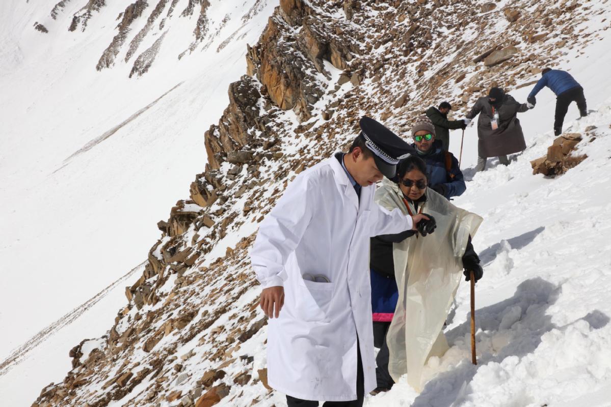 A border control officer helps pilgrims from India along a steep slope on the mountainside during their religious trek in the Tibet autonomous region on Thursday. [Photo/China News Service]