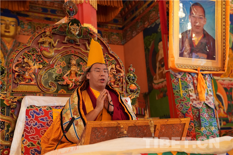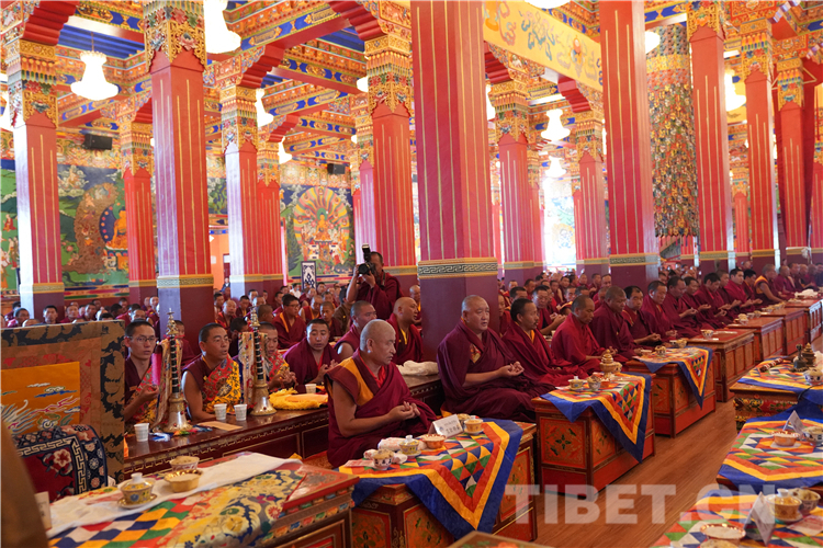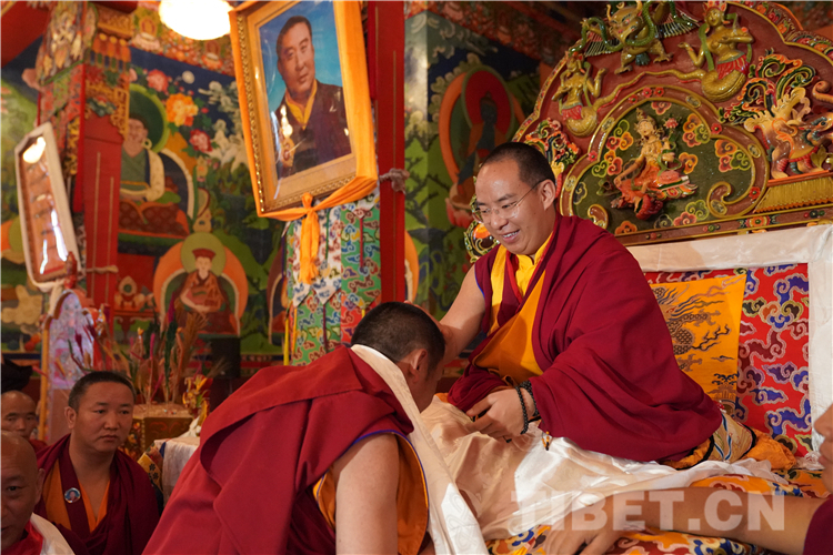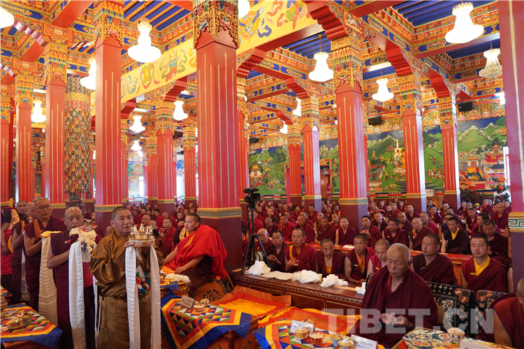Drukang Tupdeng Kedrol, dean of the Buddhist Academy of Tibet, leads monks in offering manzha to the 11th Panchen Lama.