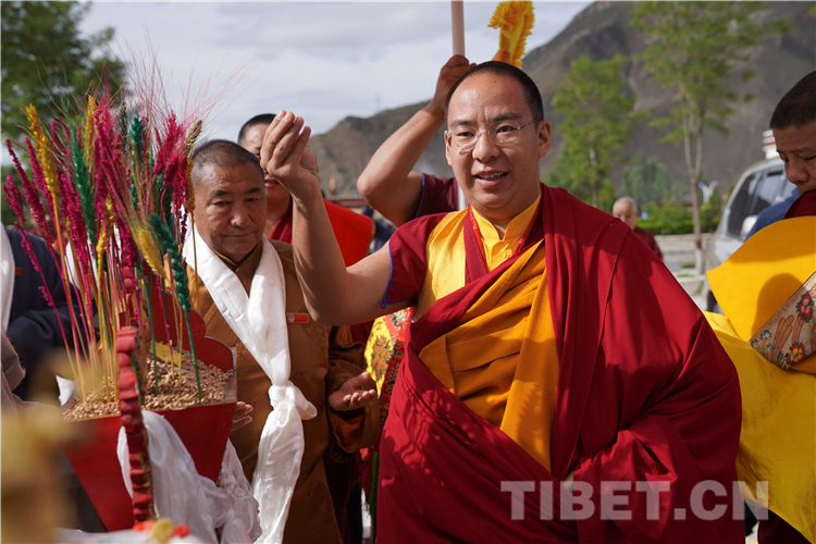 The 11th Panchen Lama scatters highland barley after his arrival.