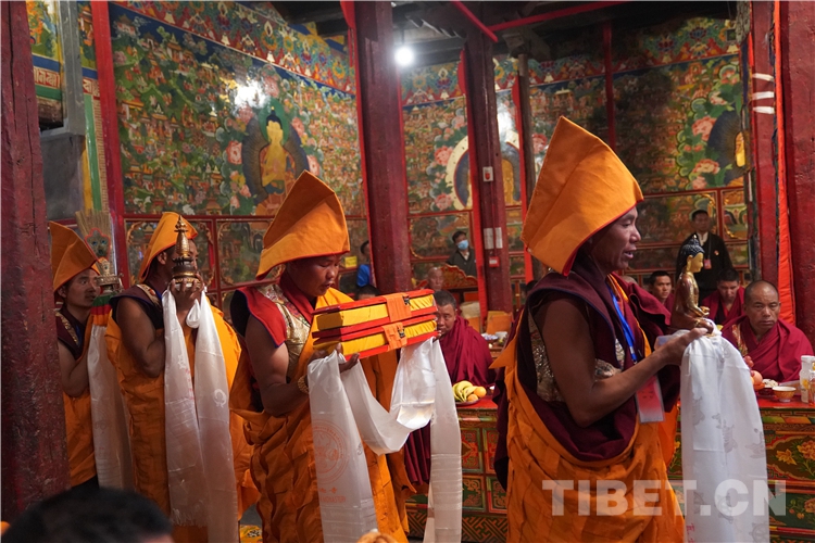 High monks of Khorchak Monastery offer Buddha statues and scriptures to the 11th Panchen Lama.