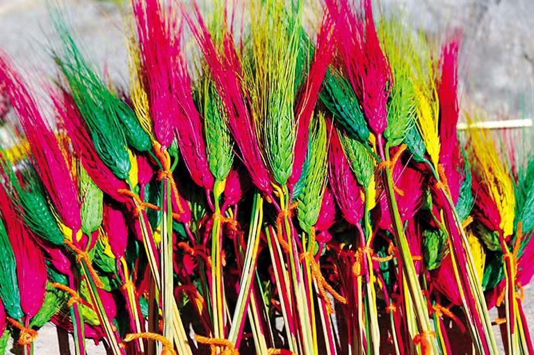 The Tibetan New Year Flowers, also known as Losar Metok, are made with wheat ears and New Year flowers (a kind of plant), which are dyed into blue, yellow, green, red and other colors. Five branches of the dyed are tied into one, which means a good harvest. It is an indispensable item on the Tibetan New Year’s “Qiema” box (a rectangular wooden box containing roasted barley and fried wheat grain which carries auspicious meanings).