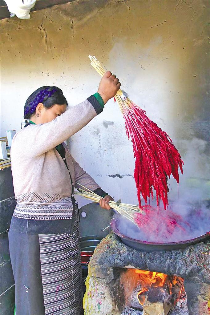 In the Tibetan-style courtyard of Sangye and her family, there sits a simple stove. Sangye boiled the water in the pot, poured the prepared paint into it and stirred it evenly. Then she put wheat ears into it, watered the wheat ears and turned them over. After dyeing evenly, she lift out the wheat ears and dried them. In this way, a handful of Tibetan New Year flowers are made.