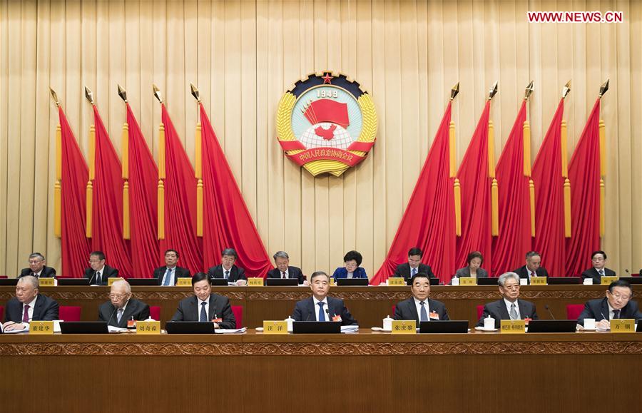 Wang Yang (C, front), chairman of the Chinese People's Political Consultative Conference (CPPCC) National Committee, attends the opening meeting of the fifth session of the Standing Committee of the 13th CPPCC National Committee in Beijing, capital of China, Feb. 28, 2019. [Photo/Xinhua]