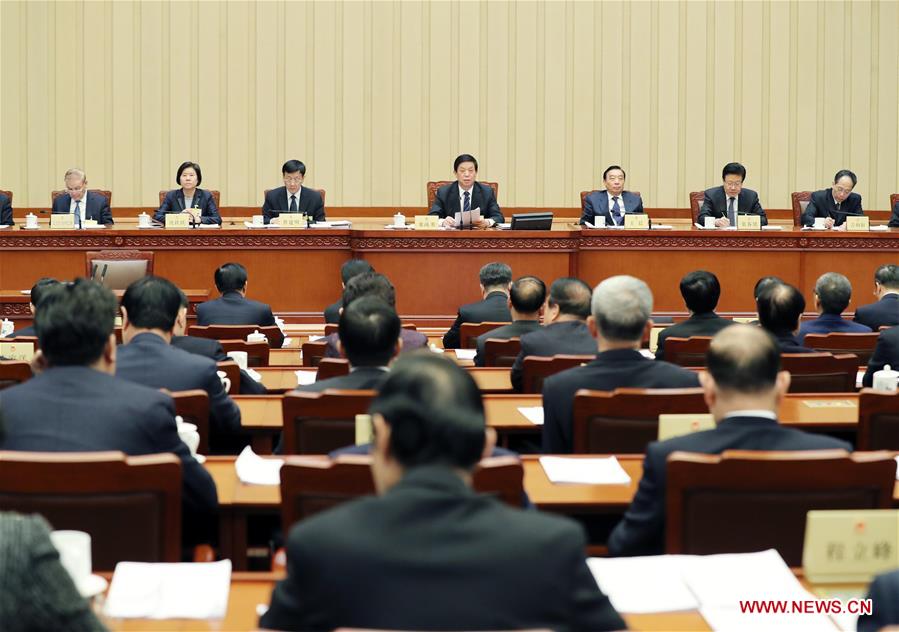 Li Zhanshu, chairman of the National People's Congress (NPC) Standing Committee and a member of the Standing Committee of the Political Bureau of the Communist Party of China Central Committee, meets with the deputies attending a bimonthly session of the NPC Standing Committee in Beijing, capital of China, Feb. 27, 2019. [Photo/Xinhua]