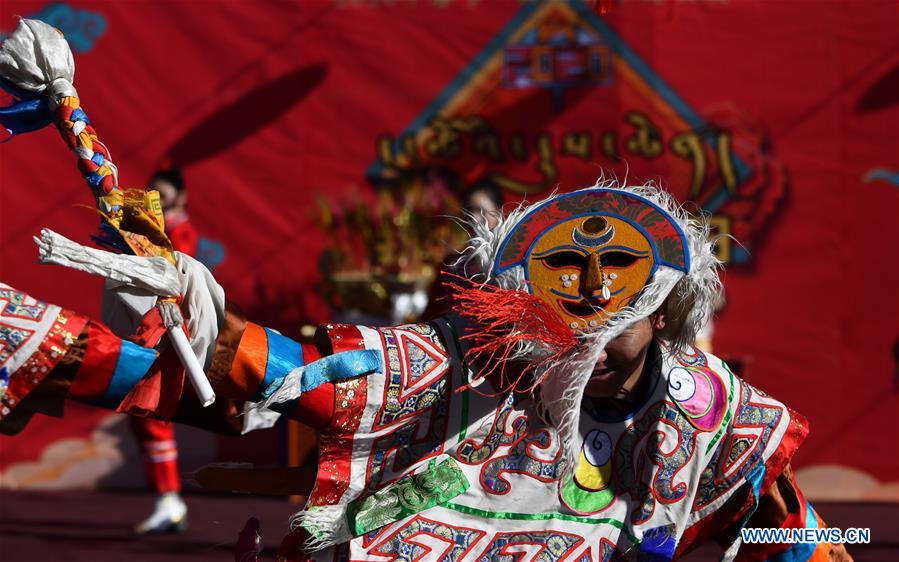 A actor perform Tibetan Opera in Doilungdeqen District of Lhasa, southwest China's Tibet Autonomous Region, Jan. 25, 2020. On the first day of the Chinese Lunar New Year, Tibetan people gathered to celebrate the festival. [Photo/Xinhua]
