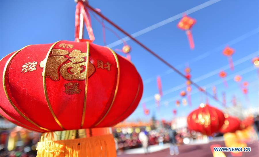 Red lanterns are seen in Doilungdeqen District of Lhasa, southwest China's Tibet Autonomous Region, Jan. 25, 2020. On the first day of the Chinese Lunar New Year, Tibetan people gathered to celebrate the festival. [Photo/Xinhua]