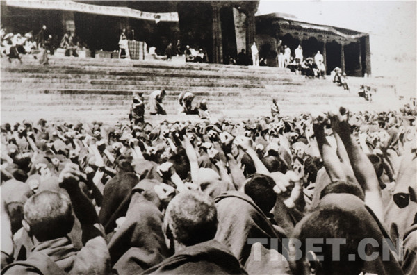Photo shows emancipated monks at Drepung Monastery, one of the three major monasteries in Lhasa, accuse the serf owners in the monastery.