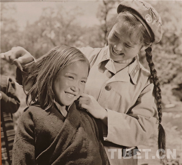 Photo shows a PLA aunt is doing up hair for me in Lhasa in 1959.