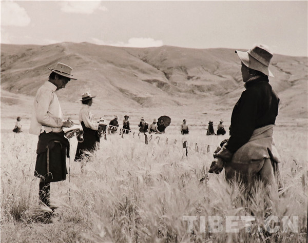 Photo shows people in Lhagyari measure and distribute land in 1959.