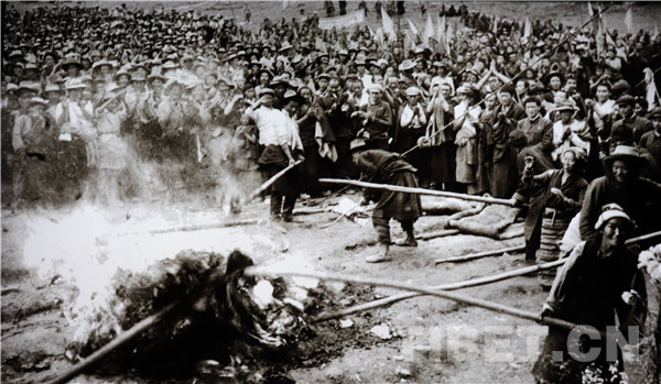 Photo shows in summer of 1959, emancipated serfs in Dargye, Zangdog Townships, Lhasa, burn their title deeds, covenants and debt contracts.