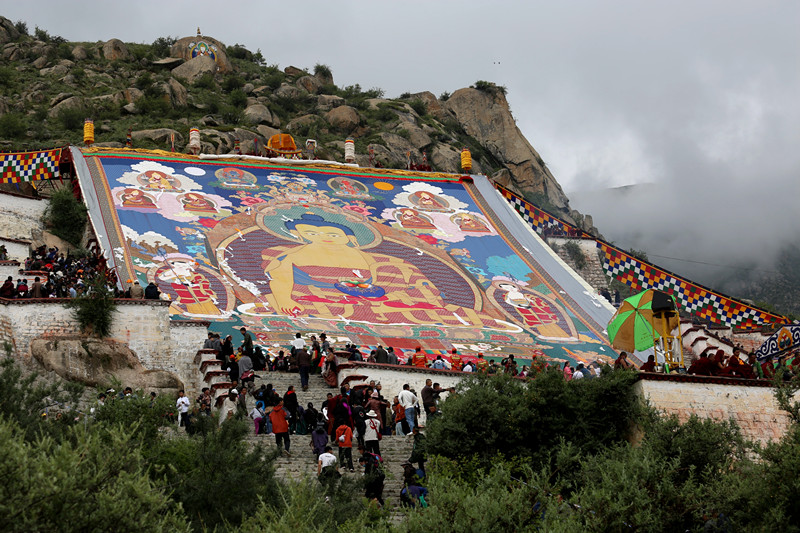 Thousands of Tibetans and tourists celebrated an exhibition of giant thangka-religious images embroidered in silk-to mark the start of the annual shoton, the Tibetan word for yogurt festival, on Saturday.