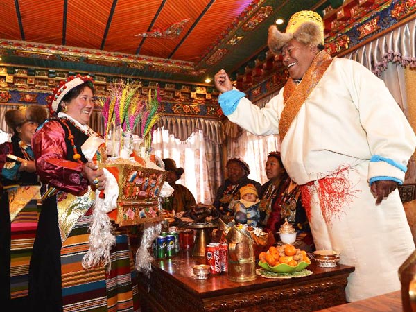 The festival’s main festivities are held over the first three days of the two-week period of the celebration, and each day is representative of a different aspect of the New Year. On the days prior to the New Year, the household is cleansed from top to bottom, and a torch made of straw, tsampa and firecrackers is used to dispel evil spirits, and is then taken out of the home and burned at a crossroads. The first day of New Year festivities is known as “Lama Losar”, and the people wake early and bathe before dressing in their newest clothes and make offerings to the gods in their own shrines. The traditional female housewife of the family will take a bucket and go to the river or lake as the sun rises to collect the first water of the year, which is sacrosanct. Then they will exchange gifts and greet the elders and each other with the traditional greeting, “Tashi Delek”, which means, roughly, “Blessings and Good Luck”.