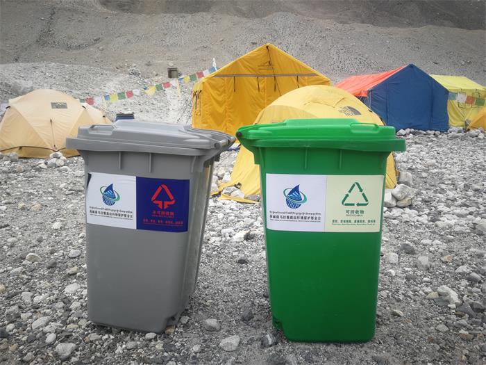 Garbage bins have been distributed to the Qomolangma Base Camp since the spring of this year.[Photo/China Daily]